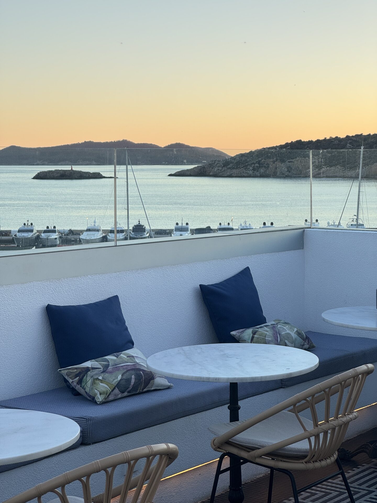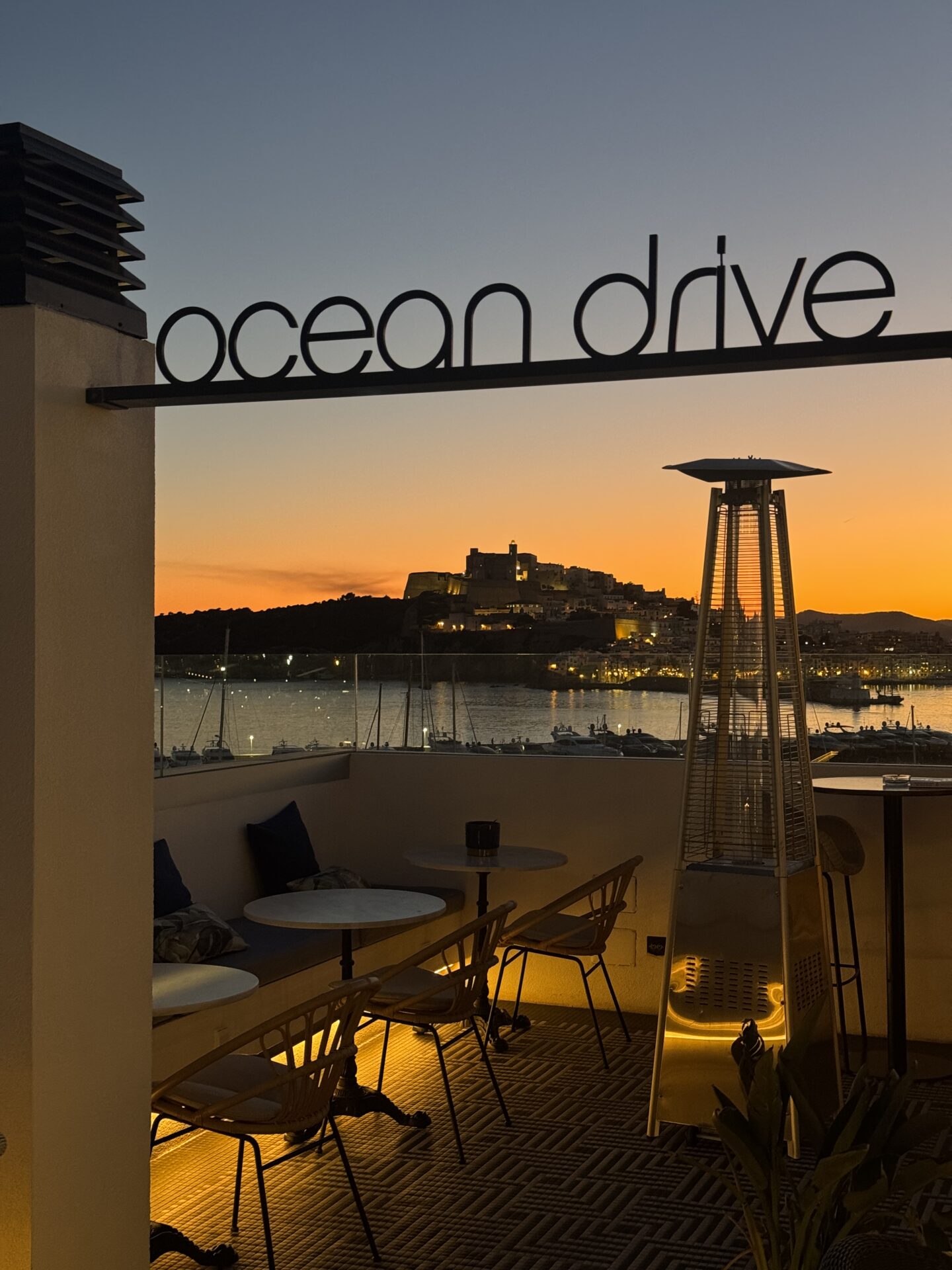 Meinen ersten Abend auf Ibiza hab ich in der Rooftop-Bar des Ocean Drive Hotels ausklingen lassen. Was unglaublich schön war – ich war nämlich der einzige Gast! 🥹 Was einerseits an der Nebensaison lag, aber andererseits auch daran, dass mein erster Abend in diesem Hotel ein Sonntag war. Da ist einfach weniger los, als an anderen Tagen, oder an Freitag/Samstag – hat mir die freundliche Mitarbeiterin an der Bar erzählt.